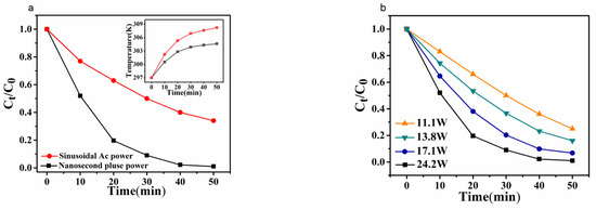 It is known that the concentrations of particles in plasma vary with the type of power supplies [34]. To decontaminate the water, sinusoidal AC power supply DBD plasma was mostly used in previous studies [34,35]. Recently, the discharge driven by nanosecond pulse power supply has attracted a lot of attention because it exhibits high current density, high average electron energy, less electrolysis, and low Joule heat. Therefore, it is worth comparing how the type of power supplies would affect the degradation efficiency. The plasma generated from two power supplies, sinusoidal AC power supply and nanosecond pulse power supply, were compared in our study.