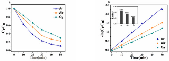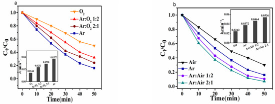 Figure 5 shows the degradation constant in argon plasma is highest at 0.046 min−1, followed by air plasma at 0.0351 min−1, and oxygen plasmas at 0.0247 min−1. The degradation efficiency follows the same order, which is the same as that for the degradation of antibiotic tetracycline [43].
