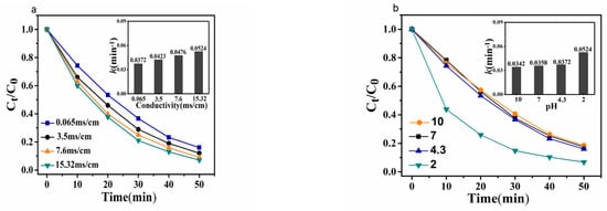 Wastewater released from the industry often contains a high concentration of salts, which may deteriorate the efficiency of any waste treatment methods [11]. Thus, to evaluate the efficiency of our method, it is necessary to study the effect of salts on the degradation of PFOA. Since there is no common salt in wastewater, we used NaCl as a representative one, and the conductivity of the solution was used as the factor to affect the degradation efficiency since the conductivity is a common property of all salt solutions. Figure 7a reveals that, the higher the conductivity, the higher the degradation efficiency and the greater the reaction rate. This suggests that the high conductivity of a solution would further increase the degradation rate, but not slow it down, which is an advantage of the SF-DBD method for PFOA degradation. This may be explained by the increase in plasma discharge current because of the higher conductivity, which leads to an increase in plasma density, resulting in more active charged species for the degradation of PFOA.