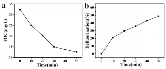 Variation of (a) TOC concentration and (b) the defluorination versus SFDBD plasma treatment time. Experimental conditions: negative pulse power; peak voltage: 15 kV; power frequency: 6 kHz; pulse width:500 ns; power: 43 W.