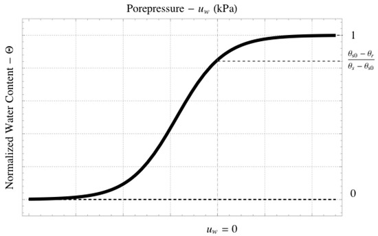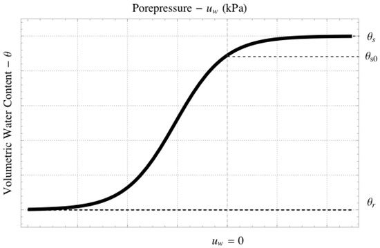 The SWRC expressed in Equation (4) is represented in Figure 1. It is important to discern that the saturation starting point is different from the full saturation point . As described in the second statement, the former is reached when the water occupies all the voids but the occluded bubbles, which are at atmospheric pressure. On the other hand, the latter can only be reached when the porepressure is so increased that the occluded bubbles are under a pressure that resizes them to a despicable volume. Furthermore, theoretically, the maximum volumetric water content () can only be truly reached if one applies a porepressure that tends to infinity.