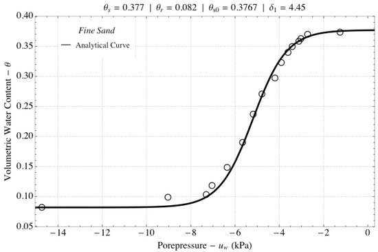 The purpose of Equation (4) is to model the behavior of both fine and coarse-grained unimodal soils. To check if the analytical expression can be used to model a coarse-grained soil, the dataset for the Fine Sand G.E.# 13 from Brooks and Corey [21] was chosen. Figure 3 shows the fitting of the analytical curve to the experimental data, highlighting the fitting parameters obtained. An extra point has been added to the dataset presented in [21] to indicate the porepressure close to saturation, i.e., the approximate intersection of the curve presented in the Brooks and Corey [21] article with their saturation line. This value was obtained graphically and corresponds to the point at −1.8 kPa of the porepressure in Figure 3.