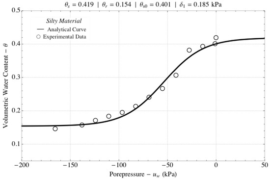 Moreover, the Silty Material from Aubertin et al. [22] was chosen to represent a fine soil. Similarly, Figure 4 shows the experimental data and the analytical curve with its fitting parameters.