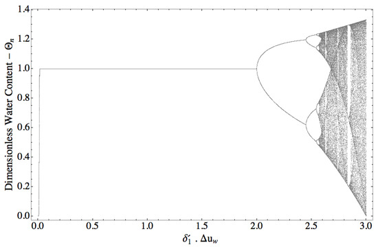 where . It can be seen that and that the parameter of the logistic map is . If one plots the normalized water content () versus the product of and the porepressure step (), it is possible to find an interesting pattern, as seen in Figure 5.
