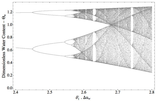 This parameter range can be used as a proxy for the adequacy of the FDM representation of the new SWRC. If the parameters’ product falls outside the pre-bifurcation interval, this indicates that the link between the continuous SWRC and its discrete approximation may not be present anymore. By now, it is important to highlight that the logistic map can be used, upon restrictions, to model the new SWRC. The possibility of extending the validity of the logistic map modeling after bifurcation to the new SWRC will be studied in subsequent papers in detail. Previous results [15,16], however, indicated that there exists a relation between discrete and continuous phenomena in geotechnical engineering.