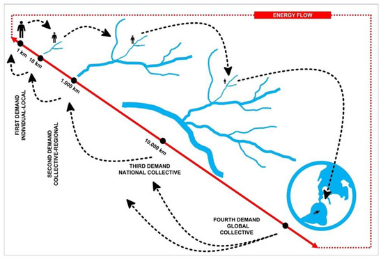 This research proposes analyzing hydrographic basins at various integrated scales by focusing on the space-time relationship, beginning with individual demands. For this reason, it is necessary to establish links between global demands and their interactions. This proposal is illustrated in Figure 1.