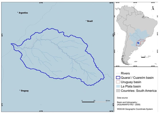 The Quaraí/Cuareím River is a tributary of the Uruguay River (Figure 2). Brazil and Uruguay share this basin as a natural border. It includes the Brazilian municipalities of Barra do Quaraí, Santana do Livramento, Quaraí, and Uruguaiana, as well as the Uruguayan Department of Artigas. The Quaraí River’s mouth is shared by the municipalities of Barra do Quaraí (Brazil), Bella Unión (Uruguay), and Monte Caseros (Province of Corrientes in Argentina).