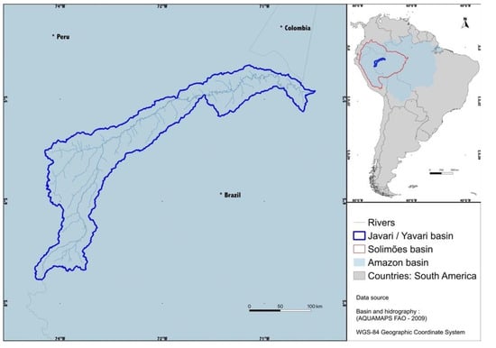 The Javari/Yavarí River is a Solimões River tributary that forms a natural border between Brazil and Peru (Figure 3). This basin includes the Brazilian municipalities of Atalaia do Norte and Benjamin Constant, and the Peruvian cities of Caballococha and Islândia. In Benjamin Constant, the Javari/Yavarí River flows into the Solimões River. There is a triple border between the municipalities of Tabatinga (Brazil), Letícia (Colombia) and Santa Rosa (Peru) near the mouth, separated by two islands called Islândia (Peru) and Petrópolis (Brazil).