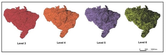 This method is used by ANA-Brazil to make hydrographic basin data for South America available (at levels 1 and 2 with fewer details). In comparison to the other bases, ANA-Brazil offers a smaller mapping scale (1:1,000,000) for cross-border countries at other levels (3, 4, 5, and 6), as indicated in the figure below.