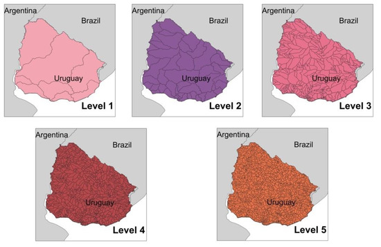 Uruguay, due mainly to its smaller territorial extent, provides hydrographic basin data derived from topographic maps at a detailed scale of 1:50,000, produced by its military geographic service (SGM). In contrast, the detail level is restricted to Uruguayan territory, making this the only analyzed database that does not provide cross-border data (Figure 8).