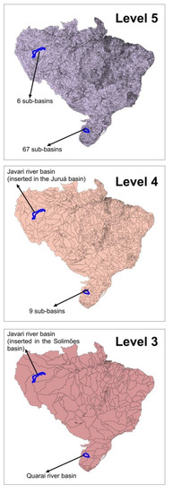 Brazilian Ottobacias (levels 5, 4, and 3) and case study basins.