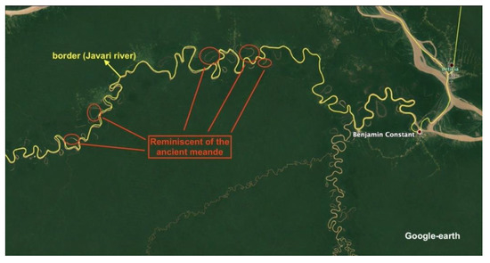 Another issue was discovered during a literature review on the Amazonian transboundary sub-basins: while there are no scientific or political concerns regarding Brazil and Peru’s borders, the borders of Javari/Yavarí River demonstrate a striking natural characteristic that constantly changes the river’s course, creating two different positions of the border for each country, particularly in regions with no human occupation [33]. Figure 6 portrays a section of the Javari/Yavarí River with its current bed and remnants of its previous bed to demonstrate how the river’s course changes (Figure 12).