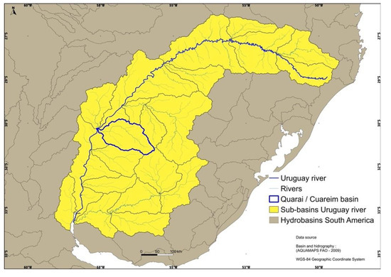 The Uruguay River is the second largest tributary of the River Plate Basin. Its basin flows across Argentina, Brazil, and Uruguay. This basin’s environmental impacts are associated with the discharge of raw sewage from its major urban centers and the widespread use of pesticides in rural areas. Pasture and cropland are the most common land uses. Other significant negative impacts on the basin’s effluent water resources derive from intensive activities related to swine, poultry, and cellulose industries [20].