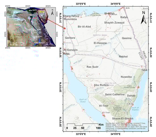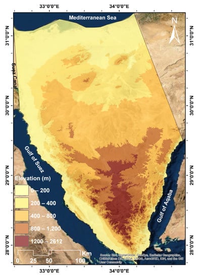 The Sinai Peninsula is located in the northeastern part of Egypt between 32.5–34.8° E and 27.8–31.3° N (Figure 1). It is about 61,000 km2 in size and its largest dimensions are about 385 km from north to south and 210 km from west to east. Geographically, Sinai can be divided into three parts. The northern part consists of broad coastal plains with fossil beaches and extensive sand dunes, some of which are more than 100 m high. The main part is the wadi El-Arish basin which descends from an altitude of more than 900 m to the Mediterranean Sea and forms the largest valley of the Sinai Peninsula. The center is highland mainly composed of two limestone plateaus, El-Tih in the south and El-Egma in the north, where the sources of the wadi Al-Arish arise. The southern part consists of high and rugged mountain ranges of igneous rock, reaching more than 2400 m, with Mount Catherine at 2642 m above sea level being the highest point in Egypt.