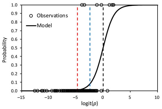 Predicted and observed flash flood probability against logit(p): dots are observed flash flood probabilities, the solid black line represents the probability predicted by the logistic model, the red dotted line corresponds to the mean of the model predictions, logit(p) = −4.74, the blue dotted line to the mean of the observations, logit(p) = −2.44, and the black dotted line with logit (p = 0.5) = 0.