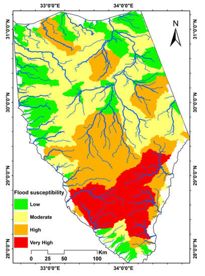 The flash flood susceptibility map (Figure 5) shows the spatial distribution into four categories: very high, high, moderate and low susceptibility. The very high sensitivity zone is located in the mountain ranges of the southern Sinai and consists of six major basins known for their flash flooding, such as wadis El-Aawag, Feiran and Kid and the upstream sub-basins of wadis Dahab and Watir, which in total represent an area of approximately 8000 km2, or 15% of the total area of Sinai. The high sensitivity zone is mainly in the center of the Sinai Peninsula and some scattered areas further north. It encompasses 16 river basins, covering a total area of approximately 15,000 km2 or 28% of the Sinai area, including some upstream sub-basins of wadi El-Arish, sub-basins of wadi Dahab and Watir, and the basins of wadis Sedri, Garf and Werdan which drain into the Gulf of Suez. The basins in the north are wadi El-Beada in Bir Al-Abd, which drains to the Mediterranean, and two sub-basins of wadi El-Harish in El-Hasana and Quasisma, respectively, which may be the source of the flash floods that have been observed in this wadi. The moderate sensitivity zone is mainly located in the north of the Sinai Peninsula and includes 36 watersheds with a total area of about 21,000 km2 or 39% of the Sinai area. These are usually smaller to medium sized basins located in flatter areas. The low-sensitive zone comprises 45 catchments with a total area of approximately 10,000 km2, or 18% of the Sinai area. These are usually very small basins on flat terrains with short drainage paths and few branches. Most are located in the north and center along the periphery of the Sinai Peninsula; some are also found in the southern part of Sinai. The resulting flash flood sensitivity map is largely consistent with flash flood observations that occurred in different regions of the Sinai and with the findings or predictions of other studies [,,,,].