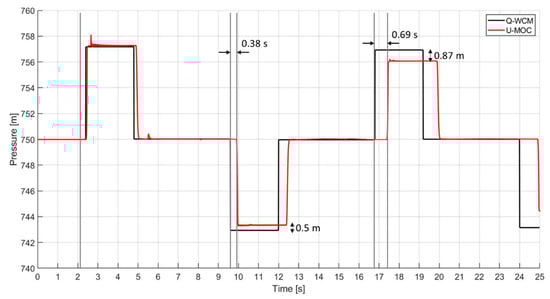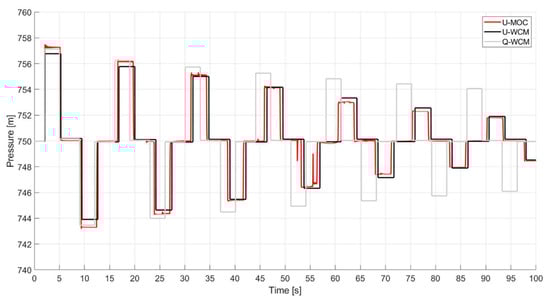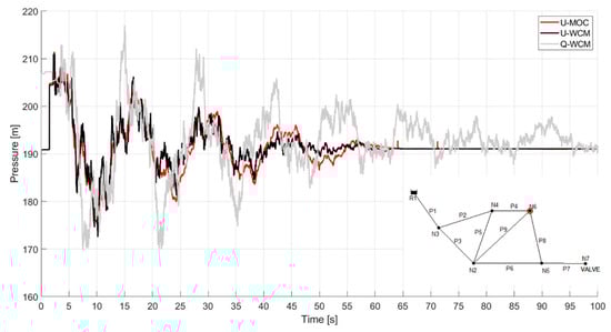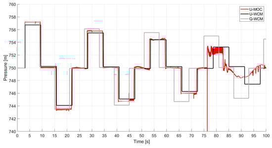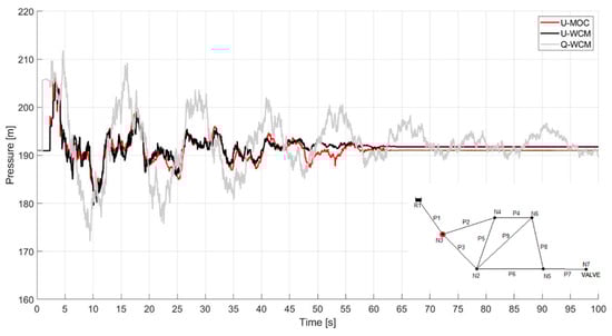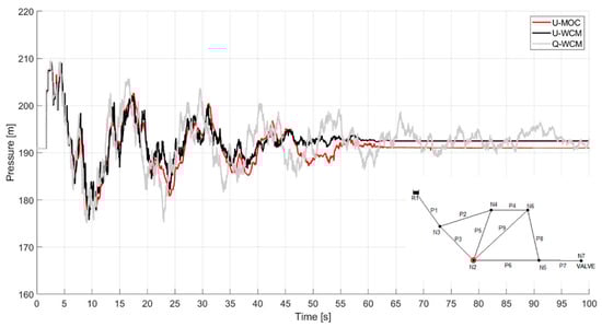 In this instance, the same parameter values (α = 0.2, β = 100) were tested for a different node (node 2). It is important to emphasize that these parameters were calibrated specifically for node 6. Figure 8 illustrates the transient response for the three models examined, using colors consistent with the previous graphs. In general, the U-WCM performed well until the 47 s mark, where it experienced slightly higher pressures than the U-MOC. Nevertheless, its advantages are again evident over the unmodified Q-WCM model.