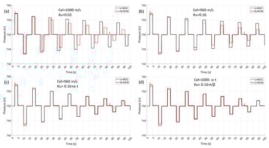 After introducing both the celerity and friction tunings to the Lagrangian model, it was beneficial to observe the influence of each parameter on the transient response. In this case study, the parameters α and β were calibrated to be 0.5 and 150, respectively. Figure 3 presents the pressure oscillation at node 2 for different tunings. The transient response shown in Figure 3a served as a baseline for these modifications since it was free of any celerity or friction adjustments. Figure 3a illustrates that the WCM pulses arrived much faster (with an increasing gape) than their counterparts in the unsteady model, largely due to differences in pressure wave celerity. By adjusting the wave velocity to 960 m/s and the Ku to 0.16, the phase difference was greatly reduced (Figure 3b); however, the amplitudes were still off. Based on Figure 3c, it can be observed that by introducing the linear damping effect for the friction factor, both models provided similar transient responses. Finally, Figure 3d illustrates the impact of adjusting both the celerity and friction factor, where the transient response of U-WCM is remarkably similar to that of U-MOC.