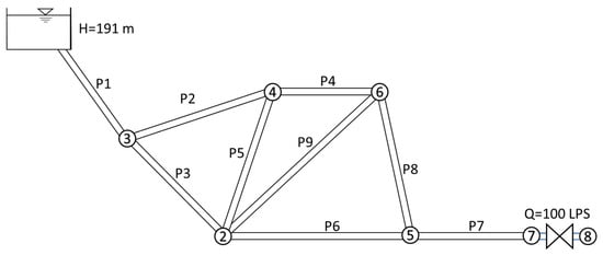 The second network resembles a more complex pipeline system featuring four loops and a valve at the downstream. There was one source of water at an altitude of 191 m, nine steel pipes of varying properties, and a 100 LPS downhill consumer. Table 1 lists the length and diameter of the pipes. The layout of the system is shown in Figure 6.