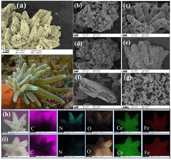 CMs are open three-dimensional (3D) frameworks that have great structural diversity as well as valuable physicochemical properties [26]. The morphologies of the fabricated CeFe-CM precursor and its corresponding pyrolysis product of CeFe-CM-T were characterized by SEM, as shown in Figure 1. An interesting “sea anemone”-shaped 3D microstructure with dozens of conical tentacles was observed in the SEM images of CeFe-CM (Figure 1a–c), and every tentacle had an opening at its end. The CeFe-CM provided a precursor to synthesize the CeFe-based oxides, i.e., CeFe-CM-T, whose morphology in Figure 1d–e well-maintained the 3D “sea anemone” structure but was rich in a porous and rough structure on the “sea anemone” body. This observation verifies the excellent self-templating role of CeFe-CM in fabricating porous CeFe-based oxides via a high-temperature pyrolysis process. It can be found that the special microstructure of the CeFe-based oxides in this study is significantly different from that of the commercial Ce-based and Fe-based oxides (Figure 1f,g). The commercial CeO2, in Figure 1f, shows a typical lamellar structure with tightly stacked nano-layers of large sizes, and the commercial Fe3O4 presented random particles with 100~300 nm sizes (Figure 1g). According to the element mapping in Figure 1h,i, the two metals, Ce and Fe, are uniformly distributed on the “sea anemone” structure of CeFe-CM, and the trace amount of O elements was derived from the structural water in the frameworks of CeFe-CM. After high-temperature oxidation, the amount of O element largely increased in the CeFe-CM-T framework, and most of the N element disappeared due to the decomposition of the CN ligand. The element signals of Ce and Fe were elevated to a certain extent on CeFe-CM-T, compared to its precursor.
