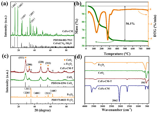 XRD patterns of (a) CeFe-CM and (c) CeFe-CM-T, CeO2, Fe3O4; (b) TG and DTG curves of CeFe-CM; (d) FTIR spectra of CeFe-CM, CeFe-CM-T, CeO2, and Fe3O4.