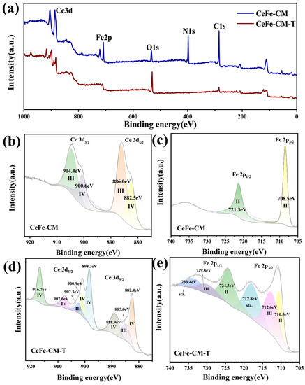 (a) XPS spectra of CeFe-CM and CeFe-CM-T; high-resolution XPS spectra of Ce 3d and Fe 2p of CeFe-CM (b,c) and CeFe-CM-T (d,e).
