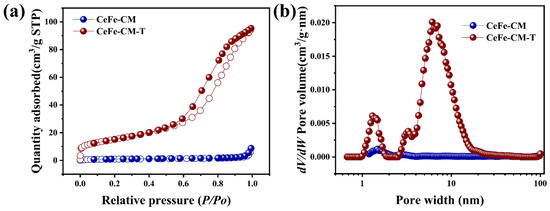The specific surface area and pore size distribution of the samples were analyzed by the N2 adsorption–desorption method. As can be seen in Figure 4a, the precursor of CeFe-CM shows a very low surface area (SA) value of only 3.1 m2/g, and high-temperature pyrolysis rendered a remarkable increase in the SA (54.7 m2/g) on CeFe-CM-T, due to the pore-opening process caused by an outward gas flow, as mentioned in the TG analysis. There is a small number of micropores (1~2 nm) on CeFe-CM that originated from the framework cavities that were unoccupied by structural water during the coordination process, while it created abundant micropores and mesopores on the pyrolytic product of CeFe-CM-T. What was particularly obvious in the mesoporous region was that the pore volume largely increased in the range of 3–20 nm, which provided a structural advantage for the binding-site acquisition and ion diffusion in the following adsorption process [34].