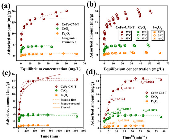 Adsorption isotherm curves of phosphate onto CeFe-CM-T, CeO2, and Fe3O4 at (a) 25 °C and (b) different temperatures (25 °C, 35 °C and 45 °C); (c,d) adsorption kinetics of phosphate onto CeFe-CM-T, CeO2, and Fe3O4.