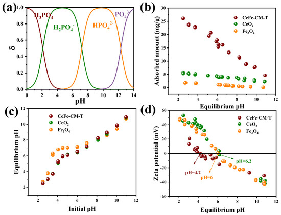 Both phosphate species and adsorbent surface properties in an aqueous solution are significantly influenced by pH [1], which determines the adsorption behavior of phosphate onto metal oxides. Figure 6a depicts the distribution of the phosphate species with respect to pH, including H3PO4, H2PO4−, HPO42−, and PO43−. The results in Figure 6b show that the phosphate adsorption of the prepared CeFe oxides was sensitive to the solution pH, and the adsorbed amount of phosphate dramatically decreased from 26.0 mg/g at pH 2.5 to 4.6 mg/g at pH 10.9, reflecting a fitness of this type of adsorbent for treating acidic wastewater. A pH isoelectric point (pHPZC) at 4.2 on the zeta-potential curve of CeFe-CM-T, as depicted in Figure 6d, was found. Below the pHPZC, the CeFe-CM-T surface was electropositive, which was favorable for the adsorption of electronegative phosphate (especially for the species of H2PO4−). Above the pHPZC, the adsorbent surface was electronegative, and electrostatic repulsion between the deprotonated surface and anions would largely prevent phosphate adsorption [37]. Indeed, the adsorbed amount of phosphate was continuously decreased with an increase in the pH. However, there remained a relatively high adsorption amount of phosphate when the solution pH was above pHPZC, indicating that other adsorption mechanisms, rather than electrostatic attraction, contributed to phosphate adsorption. Usually, ligand exchange is considered the main adsorption process of phosphate occurring on metal oxide surfaces, where the surface hydroxyl groups bonded with metal elements were exchanged by phosphate ions [8,39]. Additionally, the increased solution pH after adsorption, as shown in Figure 6c, probably originating from the exchanged hydroxyls, supported the ligand-exchange mechanism. On the other hand, the phenomenon of weak adsorption under alkali conditions can be properly used for adsorbent regeneration.