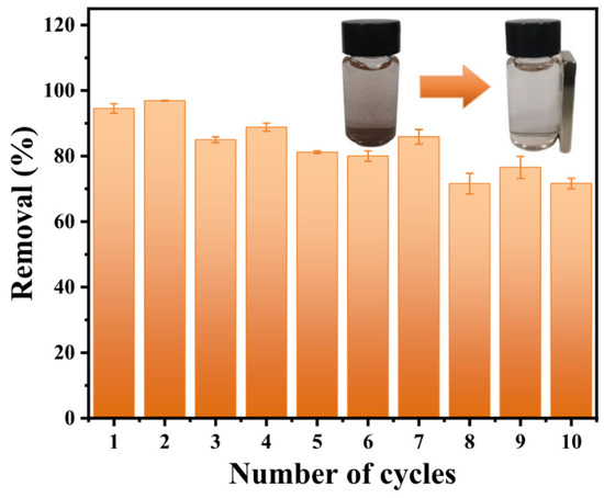 Therefore, a recycle test was performed on CeFe-CM-T, using NaOH as the regenerative reagent. As displayed in Figure 7, CeFe-CM-T can maintain phosphate removal above 90% during the first and second cycles, and even after ten cycles, the removal rate of phosphate still reaches 72%. The result reveals the excellent cycle performance of the fabricated CeFe-based oxides, where the exhausted adsorbent can be well-recovered of its phosphate capacity by alkali solution regeneration. What is more, it can be seen in the insert image of Figure 7 that CeFe-CM-T is magnetic because it contains Fe-based oxides, and this property can be fully used for adsorbent material recovery and is convenient for recycling applications via magnetic separation.