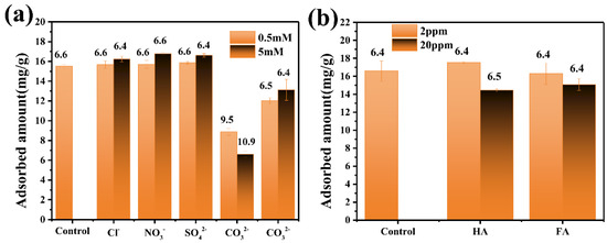 Natural organic matters (NOMs) are widely widespread in surface water, whose effect on phosphate removal is also an issue of great concern. Herein, two typical NOMs, humic acid and fulvic acid, were evaluated for their influence on phosphate adsorption. As shown in Figure 8b, there was no significant effect of NOMs on phosphate adsorption at a low concentration (2 mg/L), while both humic acid and fulvic acid showed a weak inhibition at a high concentration (20 mg/L). This should be ascribed to the shielding effect of NOMs, where a high concentration of NOMs coated the outside of the adsorbent particle and shielded the surface adsorption sites. However, CeFe-CM-T displayed high selectivity and applicability for phosphate removal in a co-existing aqueous environment.