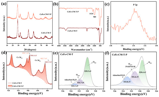 (a) XRD patterns and (b) FTIR spectra of CeFe-CM-T before and after phosphate adsorption; high-resolution XPS spectra of (c) P 2p of CeFe-CM-T-P, (d) Ce 3d, and (e,f) O1s before and after phosphate adsorption.