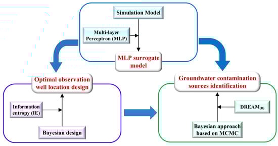 The MLP, which is a type of machine learning approach, is applied to construct a surrogate model for the original simulation model, which is directly invoked for the optimal design of OWLs and the high-precision identification of GCSPs. The constructed MLP surrogate model can significantly reduce the computing load and computing time, which shows that the processes of design and identification can be greatly accelerated by integrating surrogate modeling and machine learning. Overall, the accuracy and effectiveness of the proposed approach were verified through case studies of homogeneous and heterogeneous media in this study. In summary, this study highlights that the integrated Bayesian and machine learning approach provides a promising solution for the high-precision identification of GCSPs. In future research, a numerical case of groundwater contamination source identification that is closer to the real situation will be established to further illustrate the feasibility and effectiveness of the approach proposed in this paper.