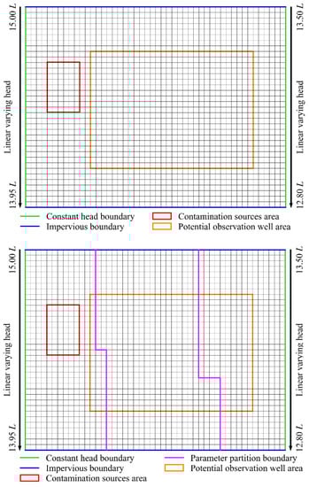 Moreover, the observation well locations (OWLs) largely affect the identification accuracy of GCSPs [,]. However, it has usually been assumed that OWLs are known prior to Bayesian inversion of GCSPs in previous studies [,,]. Generally, the identification of GCSPs will be more effective and accurate when the measurements of OWLs have more valuable information related to unknown GCSPs [,]. Moreover, the Bayesian design is applicable to high-dimensional nonlinear systems such as the groundwater contaminant transport model [,]. Therefore, information entropy (IE), which is a quantitative measurement index of information, is employed to scientifically and effectively determine optimal OWLs through Bayesian design prior to the high-precision identification of GCSPs in this study.
