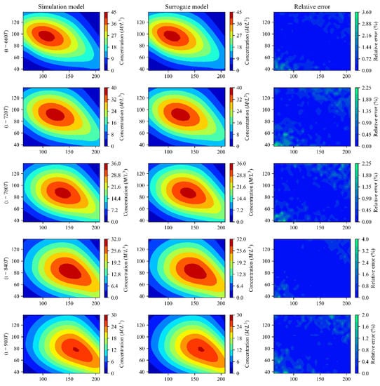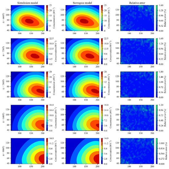 Output and relative error of simulation model and surrogate model for Case 2 (the x-axis and y-axis represent the length and width of the flow field, respectively).
