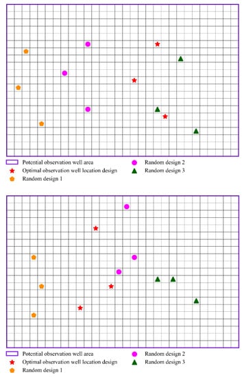 According to the constructed MLP surrogate model and Equations (5)–(7), the values of are obtained for all of the potential OWLs. According to the meaning of IE, the observation well design scheme with the minimum value of is regarded as the optimal observation well design scheme. Three optimal OWLs were obtained to suit the needs of the two case studies.