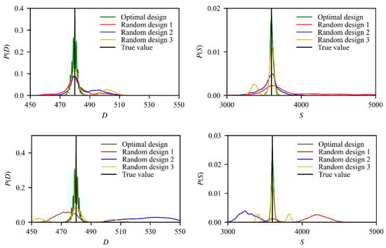 Comparison results of the posterior probability distributions for the optimal design and 3 other random designs for Case 1 (Upper) and Case 2 (Lower).