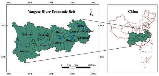 The Yangtze River Economic Belt (called YREB in this research) is located in the hinterland of China, covering an area of about 2.05 million square kilometers (Figure 1), including 11 provincial administrative regions (Shanghai, Jiangsu, Zhejiang, Anhui, Jiangxi, Hubei, Hunan, Chongqing, Sichuan, Yunnan, and Guizhou), with more than 600 million people living in the area. After years of rapid development, the YREB has now become one of the new economic strategic supports and growth poles in China’s regional development pattern. In 2020, the GDP of the YREB was about 47.2 trillion yuan, accounting for 46.4% of the country’s GDP. However, despite achieving huge economic construction benefits, there are problems such as the continuous decline of environmental quality and the intensification of water resource constraints in the YREB. The causes of water-related problems in the YREB are complex, and there is a prominent contradiction between protection, restoration, governance, and development, with regional development sustainability and coordination seriously threatened. It is urgent for all regions in the YREB to coordinate the upgrading of industrial structure, ecological environmental protection, and efficient utilization of water resources with the overall high-quality development. Since the development of the YREB was elevated to a national strategy in 2014, how to coordinate social development, water resources utilization, and environmental protection, and achieve a holistic and systematic development of the YREB, has become a top priority. Therefore, scientific analysis of the coevolutionary relationship between water resource utilization, environmental protection, and social development has important practical significance for promoting the sustainable development and the harmonious symbiosis of human and water of the YREB.
