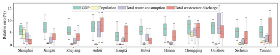 The research object of this model is each provincial administrative region in the YREB. The model runs from 2006 to 2035. The model parameters are calibrated using the SCE-UA algorithm, which is a compound optimization algorithm often used for global parameter calibration [40]. Due to the relatively short historical observation data series, the data set from 2006 to 2019 was adopted to validate and calibrate the model. The period from 2020 to 2035 is the prediction stage of the model, in which policy factors affecting the changes in economic and social indicators are selected with reference to “Plan and Outline”, as well as the corresponding planning of each provincial administrative region. Due to the large number of variables in the model, some representative key variables (GDP, population, total water consumption and total wastewater discharge) were selected to verify the model. As shown in Figure 3 and Figure 4, the fitness of the simulation results and statistical data on the trend is acceptable. During the verification period, the relative error average and median of the representative indicators are generally within 10%, which could indicate that the model has good system stability and simulation effect. Additionally, the sensitivity degree to changes in parameters was analyzed with reference to the sensitivity calculation methods [41]. Four important parameters were selected for sensitivity analysis, namely the technology conversion coefficient (), the GDP growth rate (), the population growth rate () and industrial added-value growth rate (). Total water consumption () and total wastewater discharge () were selected as the target variables for the sensitivity analysis. The results of the sensitivity analysis are shown in Figure 5, and it can be seen that most of the sensitivities are less than 10% and only a small number of the target variables are more sensitive to parameter adjustments, which indicates that the model is insensitive to parameter changes and relatively robust. That is to say, it can effectively simulate the real process of the system.
