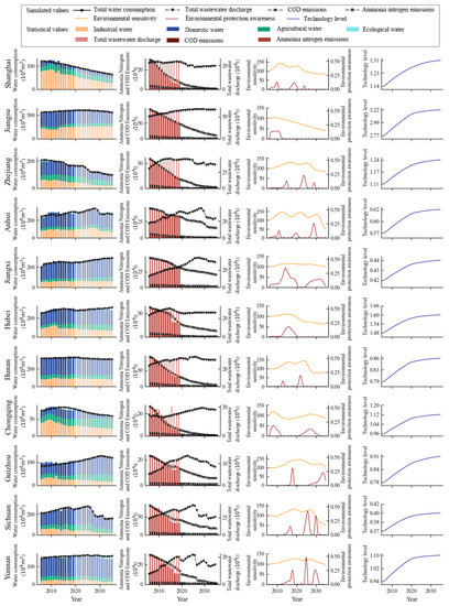 Simulation results of co-evolution of water resources-society-environment in 11 provincial administrative regions of the YREB. Note: In order to reflect the change in the proportion of water use during the forecast period, the simulated values of various water consumption results after 2020 are represented with corresponding colors with lower saturation.