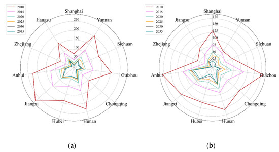 Since the launch of the development strategy of the YREB, 11 provincial administrative regions have accelerated the promotion of eco-friendly development, with industrial structure and water resources utilization continuously optimized. As shown in Figure 6, the water consumption per 10,000 yuan of GDP and the water consumption per 10,000 yuan of industrial added value in each provincial administrative region varies greatly in 2010. With the advancement of the green development pattern, the water consumption per 10,000 yuan of GDP and the water consumption per 10,000 yuan of industrial added value in each provincial administrative region will gradually decrease during the forecast period, and the gap between provincial administrative regions will gradually shrink. By 2035, the water consumption per 10,000 yuan of GDP and the water consumption per 10,000 yuan of industrial added value in each provincial administrative region will have converged to less than 100 m3, which reflects a good expectation of continuous improvement of regional water use efficiency under the guidance of the technological level improvement and the policy factors related to eco-friendly development.