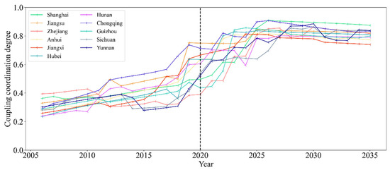 The calculation results of the CCD of the 11 provincial administrative regions in the YREB are shown in Figure 7. The CCD trajectory of the SWE coupling system in each provincial administrative region is relatively similar, basically showing the trend of “stable-up-stable”. From 2006 to 2014, the demand for water resources in various provincial administrative regions gradually increased, and the negative impact of social development on the environment became increasingly apparent. The degree of coordinated development among the three subsystems of society, water resources, and environment is relatively low, and the CCD of each provincial administrative region grows slowly, basically in the range of 0.2 to 0.5. After the YREB was established as a major national development strategy in 2014, the provincial administrative regions of the YREB have comprehensively strengthened the rational development and effective utilization of water resources, and intensified efforts to manage the ecological environment. The growth rate of the CCD of each provincial administrative region has gradually accelerated, transitioning from slow to rapid growth. During the 14th Five-Year Plan period, the CCD of each provincial administrative region is expected to continue to grow, and the comprehensive social and economic development, water resources utilization and environment protection show a trend of coherent and substantial improvement. It is expected that the CCD of each provincial administrative region will reach a high level around 2025, reflecting that the 14th Five-Year Plan has played a good policy-supporting role in the coordinated development of the YREB.