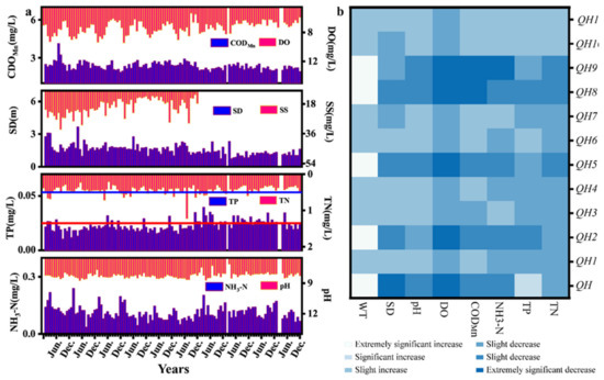 The MK test results showed that both DO and SD in Qionghai Lake showed extremely significant decreasing trends (S < 0; p < 0.01) from 2011 to 2020 (Figure 2a,b). The SD declined by 0.78 m (Figure 2); the growth and functions of aquatic plants may therefore have been affected due to insufficient light [23,54]. The successive rainfall washed a large amount of sediment into the lake, resulting in the inferior SD of Qionghai Lake in the monsoon period [52]. Furthermore, the resuspension of pollution loads in sediment and increase in algal blooms also contributed to the decrease in SD in Qionghai Lake [55,56].