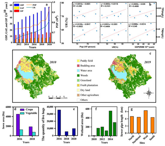 (a) Gross domestic product (GDP), gross agricultural product (GAP), gross industrial product (GIP), population (Pop), and urbanization rate (UR) of Xichang City from 2011 to 2020. (b) The results of linear fitting of TP and TN with GDP, population (Pop), and urbanization rate (UR), respectively. (c) Land-use patterns in Qionghai Basin in 2010 and 2019. (d) The sown area of crops and vegetables in the Qionghai Basin in 2016 and 2018. (e) The year-end quantity of hogs in Qionghai Basin in 2016, 2018, and 2020. (f) The new area of lakeside wetland in Qionghai Lake from 2010–2015. (g) The sewer pipe length in Qionghai Basin on the northern, northeastern, western, and southern lakeshores.
