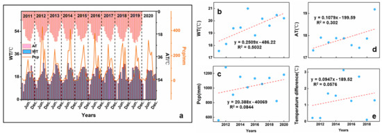 (a) Monthly average water temperature (WT), air temperature (AT), and precipitation (Pcp) in Qionghai Lake. Annual variation trends for (b) WT, (c) Pcp, (d) AT, and (e) the difference between WT and AT.