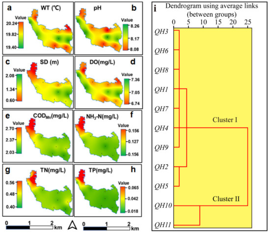 Spatial variations in (a) WT, (b) pH, (c) SD, (d) DO, (e) CODMn, (f) NH3-N, (g) TN, and (h) TP over the 11 sampling sites of Qionghai Lake. (i) Dendrogram based on agglomerative hierarchical clustering of the 11 sampling sites for Qionghai Lake.