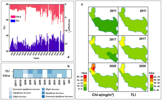 (a) Temporal variations in TLI and Chl-a in Qionghai Lake from 2011 to 2020. (b) Mann–Kendall (MK) test results for TLI and Chl-a in Qionghai Lake. (c) Spatial variations in TLI and Chl-a in Qionghai Lake in 2011, 2017, and 2020, respectively.
