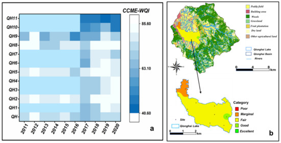 (a) CCME-WQI results with corresponding water quality status for Qionghai Lake during 2011–2020. (b) Spatial interpolation analysis based on the CCME-WQI values for 11 sampling sites in Qionghai Lake.