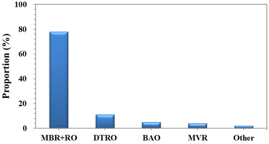 The proportion of main leachate treatment technologies. MBR + RO: membrane bioreactor + reverse osmosis; DTRO: two-stage disc tube reverse osmosis; BAO: biochemical + advanced oxidation; MVR: mechanical vapor recompression.