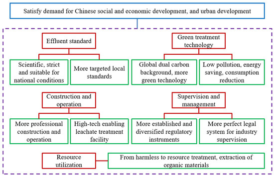 The landfill leachate industry and even the entire environmental protection industry serve the national economy, people’s livelihoods, and social and economic development; thus, its future development must meet the needs of the Chinese social economy and urban development. From the perspective of the leachate industry, its future development trends are mainly illustrated in Figure 2.